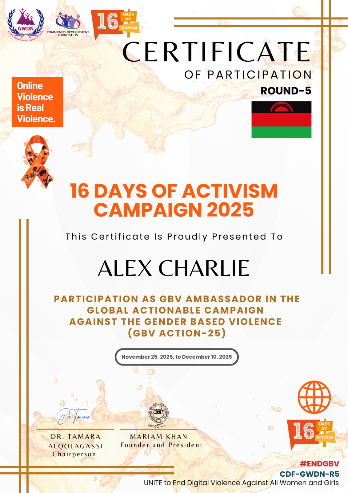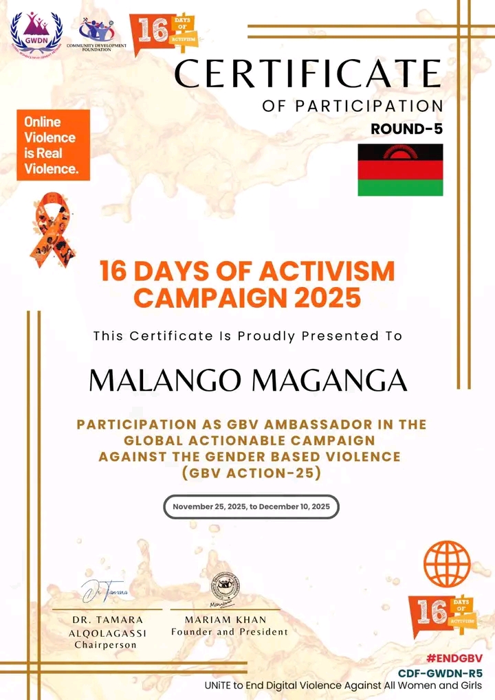 Kachere Progressive Women’s Group is proud to congratulate its Executive Director, Malango Maganga, and Communications Officer, Alex Charlie, on their recognition as GBV Ambassadors in the Global Actionable Campaign Against Gender-Based Violence (GBV ACTION-25)!